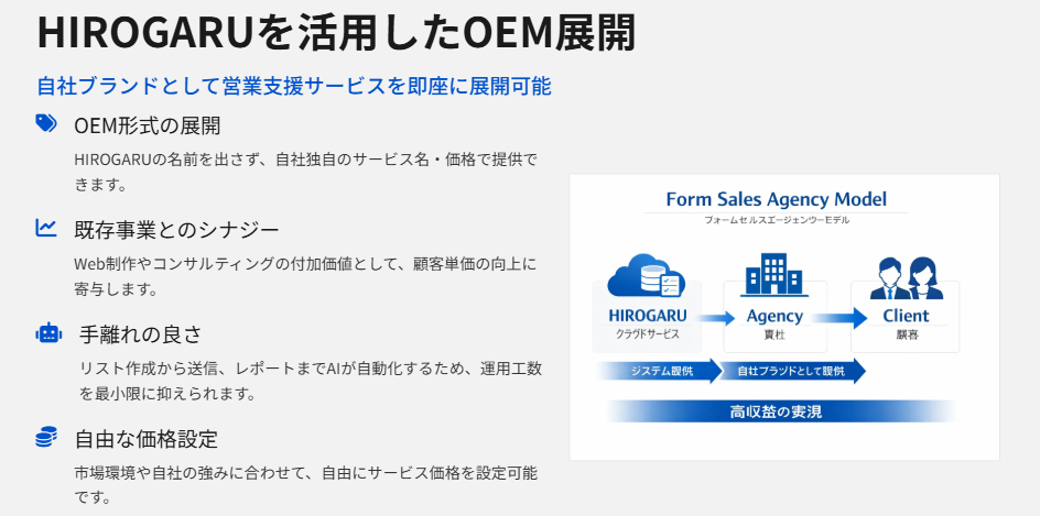 そこで現実的な選択肢になるのが、フォーム営業(企業サイトのお問い合わせフォームから提案を届ける営業)を、あなたのサービスとして提供する「代理販売(代行)」モデルです。HIROGARUを使うと、この代理販売を始めやすく、さらに高収益の形にしやすくなります。
