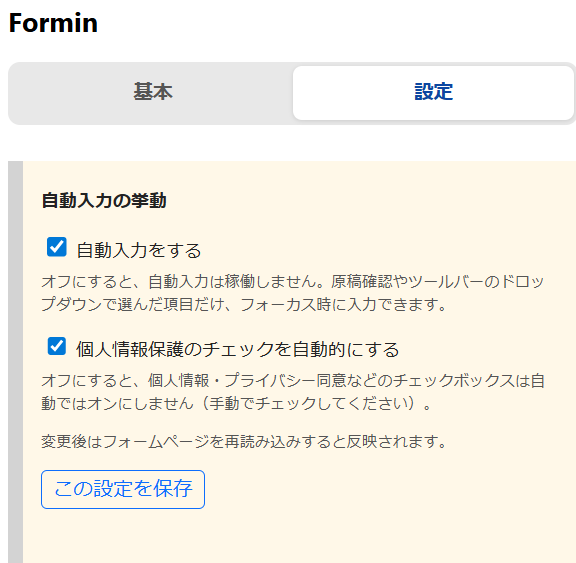 フォームが表示された場合に、自動入力がすぐにされるかを選択できます。