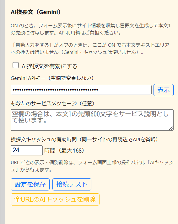 利用するには、チェックをオンにするとともに、GeminiのAPIキーを取得して登録してください。